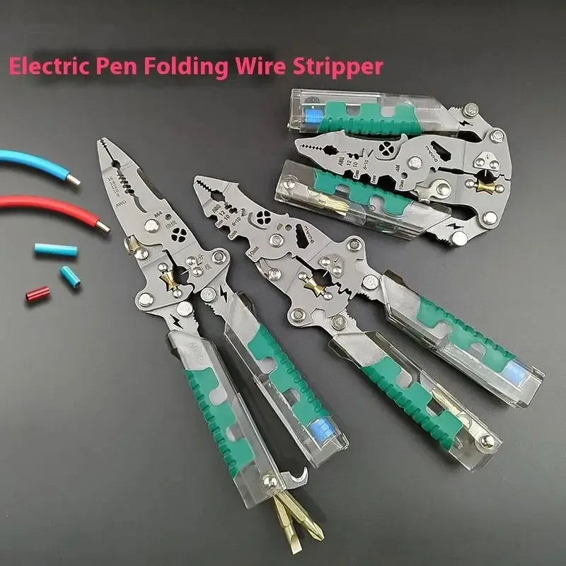 Descascador de fios dobrável multifuncional com alicate de medição para enrolamento e crimpagem de fios, cortador de cabos e ferramenta especializada para decapagem de fios elétricos.
